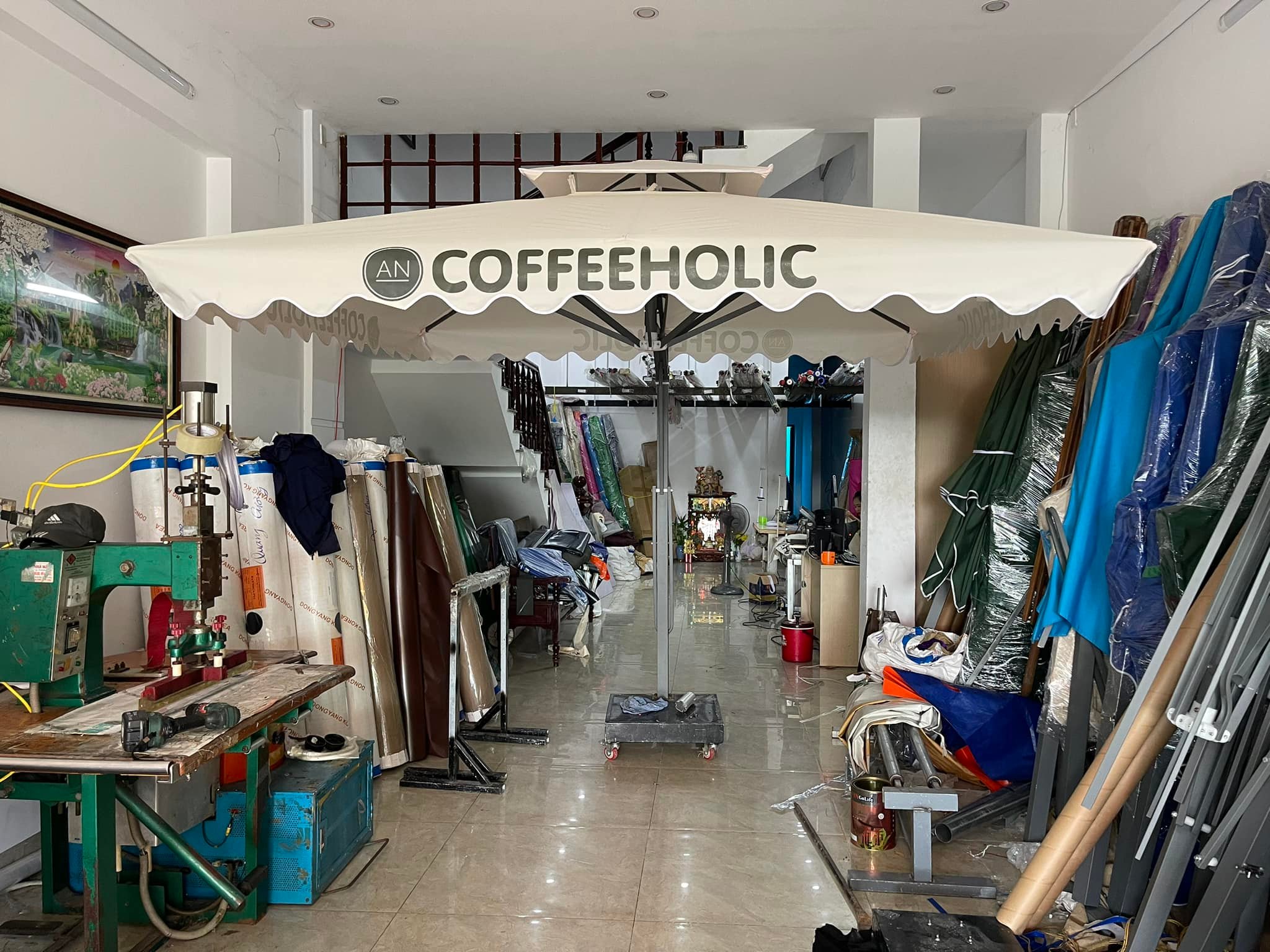 Dù che tại Ngũ Hành Sơn thường được các quán cà phê, nhà hàng, khu nghỉ dưỡng sử dụng để in logo, slogan hoặc thông điệp quảng cáo. Đây là giải pháp vừa che nắng mưa vừa tăng nhận diện thương hiệu một cách tinh tế và trực quan.